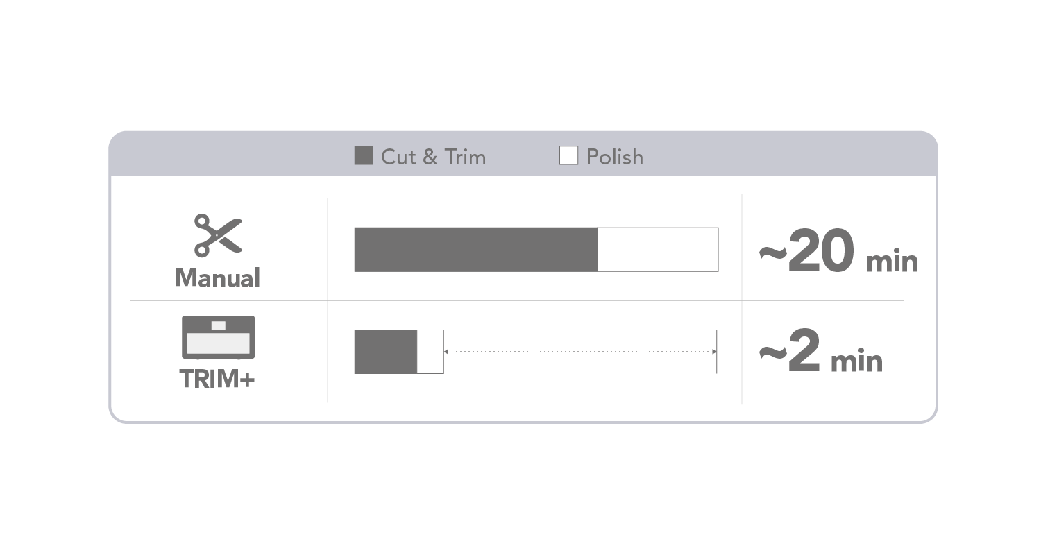 Say goodbye to tedious manual labor. TRIM+ cuts processing time by 10x, treamlining your workflow and freeing up valuable time for what truly matters in dental care.